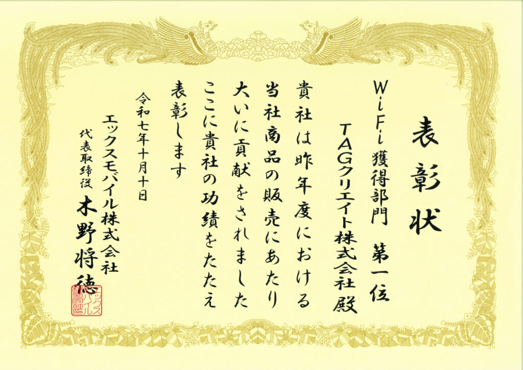 先日のホリエのWiFi(エックスモバイル株式会社)の年間授賞式において、弊社がWEB支援しているTAGクリエイト株式会社のWiFi事業が年間WiFi獲得部門第一位に輝きました。今後とも成果を出すべく手厚い支援を行っていきます。